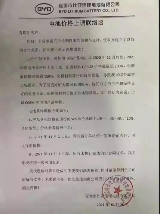 深圳市比亞迪鋰電池有限公司電池價格上調聯絡函尊敬的客戶:您好!非常感謝貴司長期以來的信賴與支持,使雙方建立了良好的合作關系,在此我司表示深摯謝意!由于市場變化,疊加限電限產影響,與2020年12月相比,2021年鋰電池原材料不斷上漲,正極材料LiCoO2價格漲幅超200%,電解液價格漲幅超150%,負極材料等供應持續緊張,導致我司綜合成本大幅提高。為了能更好的為貴司長期服務,協同雙方的生產和保持良好的業務關系,根據原材料價格上漲實際情況,我司經研究決定,上調C08M等電池產品單價。電池具體調價方案如下:1、產品含稅價格在現行的Wh單價基礎上,統一上漲不低于20%,具體型號、價格參考新報價單:2、2021年11月1日起,所有新訂單將統一簽署新的合同,并執行新價格;3、2021年11月1日起,所有未執行完成的舊合同訂單,我司系統將統一做關閉取消。此次漲價對貴司造成的不便我們深表歉意,同時希望得到貴司的諒解與支持!未來我司會一如既往地為貴公司提供優質產品與服務。順祝商祺!深圳市比亞迪鋰電池有限公司2021年10月25日
