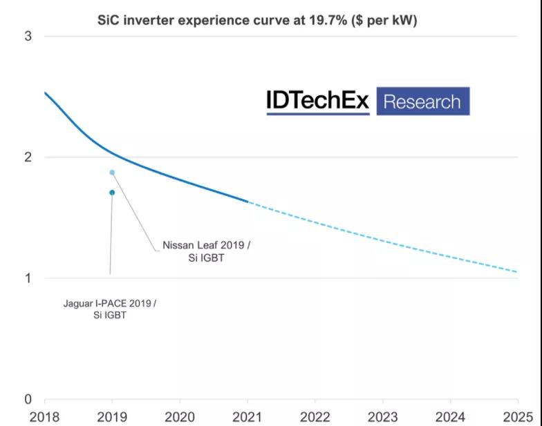 據(jù)IDTechEx數(shù)據(jù),對比2018年Model 3逆變器和2020年Model Y第二代逆變器的估算成本,短短三年內(nèi),特拉斯的SiC逆變器成本大幅下降,其成本幾乎與2019款日產(chǎn)聆風(fēng)和捷豹I-PACE 的硅基IGBT模塊相當(dāng)。