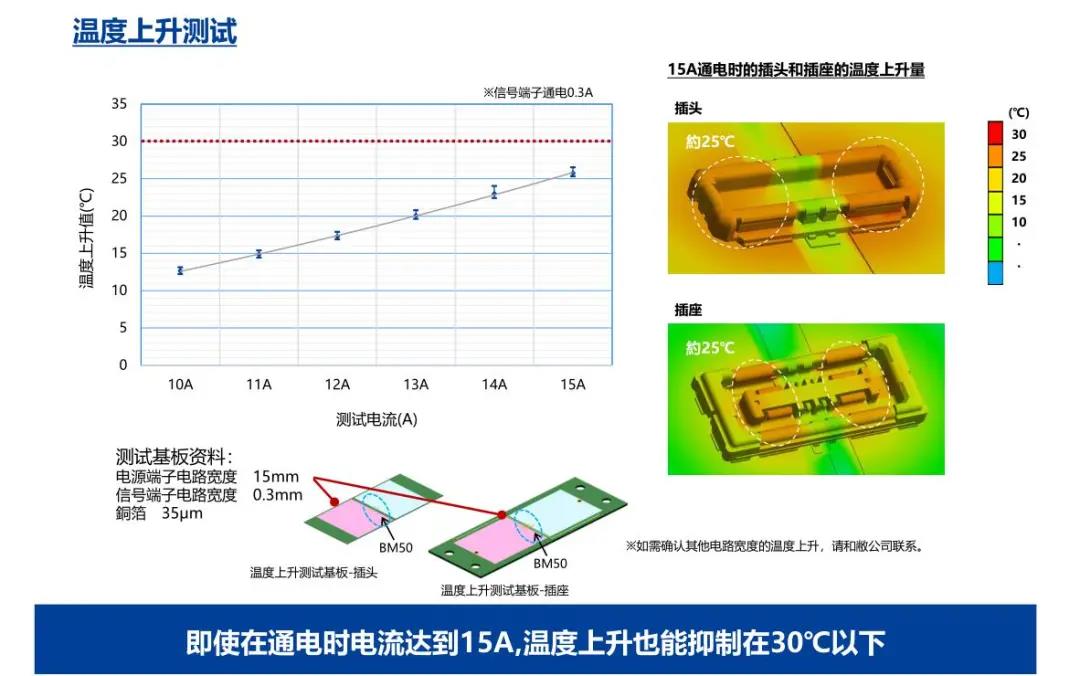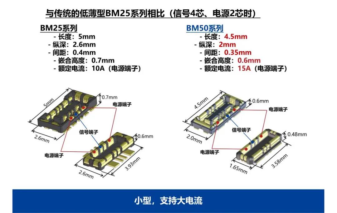 特點 1 兼顧供電能力和小型化的設計 - 額定電流:支持電源端子15A、信號端子0.3A - 嵌合高度:0.6mm、縱深:2.0mm 2 通過全包覆構造,確保高牢固性 3 使接觸電阻最小化,節省電力 4 實現小型,高抜出力 5 互相夾緊型多觸點構造,確保高接觸可靠性 有助于小型化&大電流化