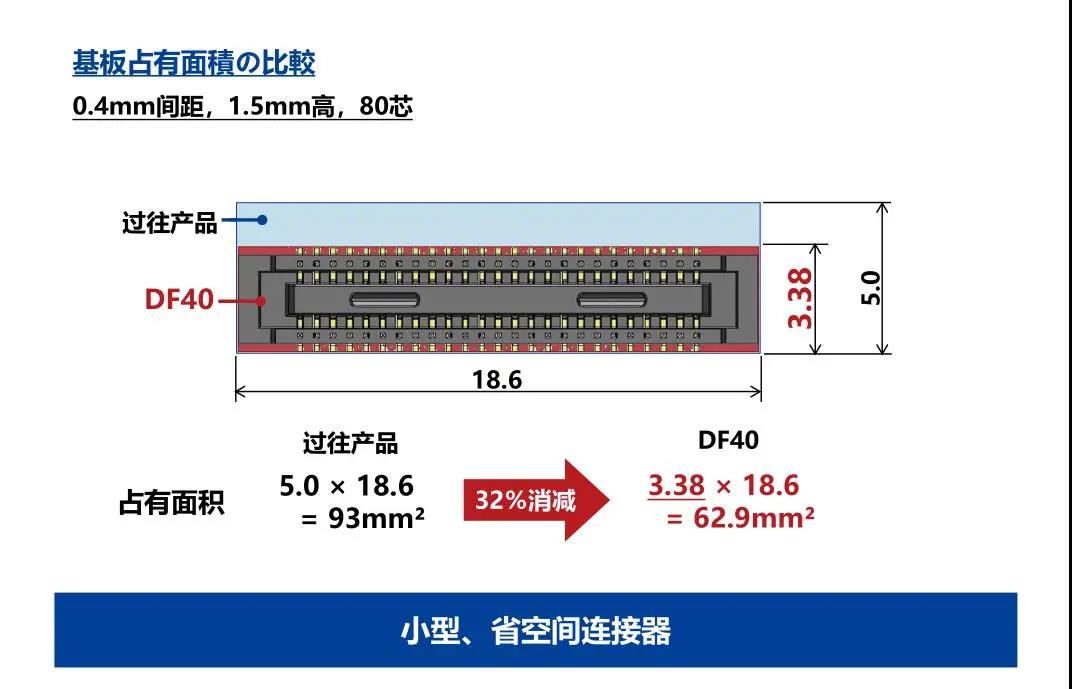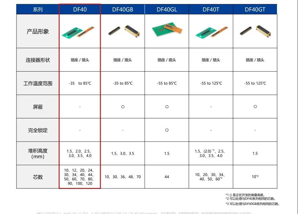 特點 1. 省空間:縱深3.38mm 2. 堆疊高度 1.5-4.0mm 3. 對應USB4 Gen.2(10Gbps)信號傳輸 *1 4. 有效嵌合長度長:0.45mm 5. 卓越的端子構造實現了明確的鎖扣手感以及大嵌合力 6. 防止端子變形構造 7. 種類繁多(帶護罩:DF40G系列,帶完全鎖:DF40GL系列,ADAS:DF40T系列) 8.核心數量從10到120核心變化巨大 9.用導向肋確保自動對準:0.33mm 10.防止鎳阻擋層焊接的結構 11.還提供用于生產線檢查的高度耐用的連接器* 只有H=1.5 mm的產品支持Type-C DF40系列變體